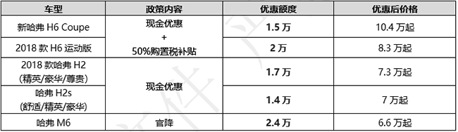 具体来说,此次上市的全新哈弗H6冠军版及哈弗H4智联版一经推出,就能在新车指导价的基础上享受高达50%的购置税补贴;而不久前推出的哈弗F5及哈弗F7也同样参与此次购置税减半活动,最高补贴超过6千元。新车上市之初即如此大幅让利,充分显示哈弗一贯对客户十足的诚意。除此之外,哈弗热销车型新哈弗H6 Coupe、2018款H6运动版均在购置税减半优惠基础上,另享有现金优惠,优惠额度最高2万元;2018款哈弗H2、H2s则享受最高1.7万元现金优惠,哈弗M6更是直接官降达2.4万元,仅售6.6万起。